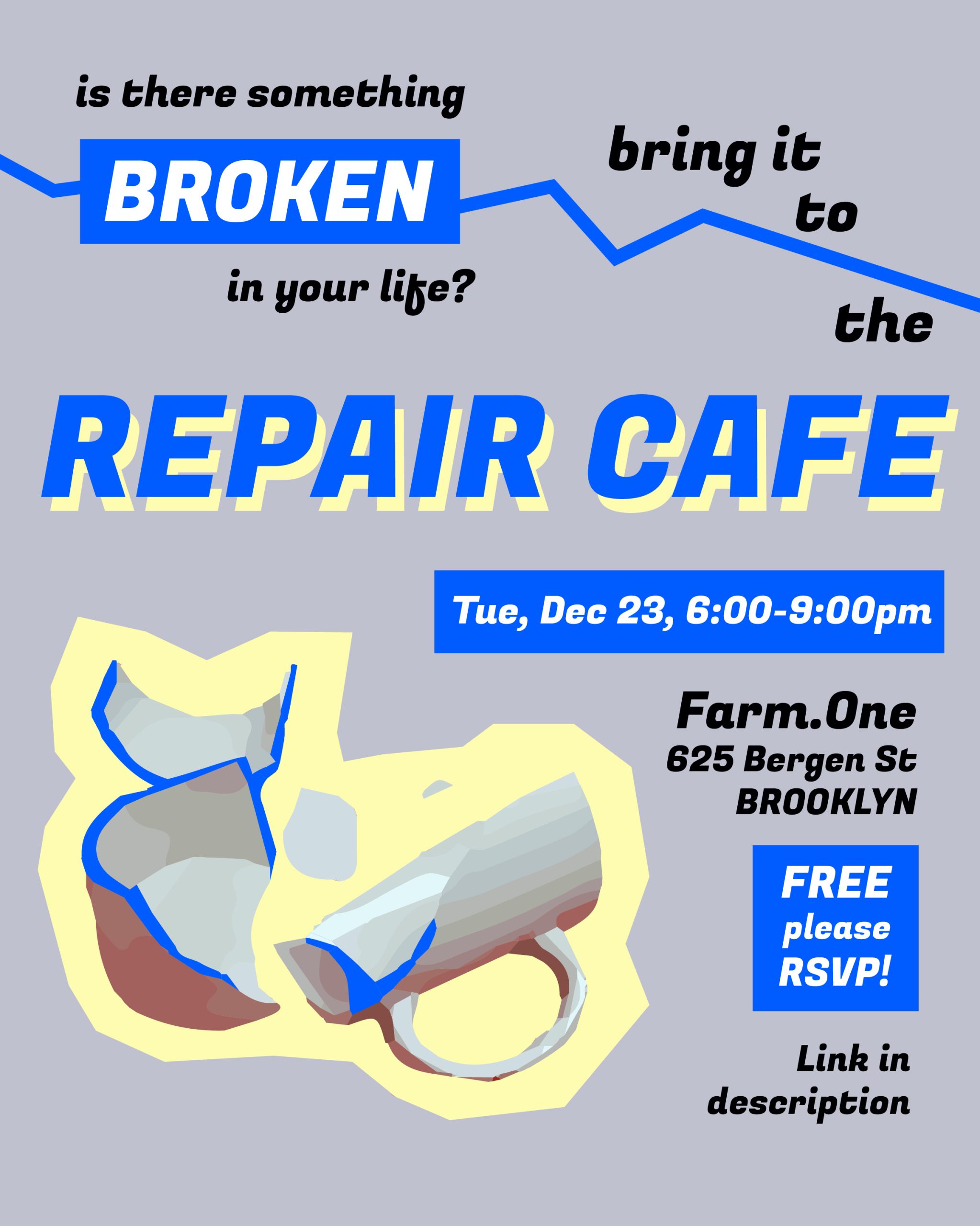 Repair Cafe is a casual hangout where people come together to diagnose and repair broken things from their life like lamps, chairs, mugs/plates, clothes or anything else you can think of. We help each other fix things, share tools and troubleshoot to prevent our things from going to the landfill. Think small, portable items (please no appliances, bicycles or couches).